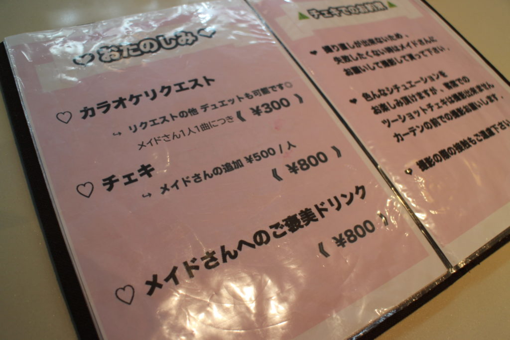アミューズメントメニューにはメイドさんにカラオケリクエストの他チェキ、ご褒美ドリンクがあります。
