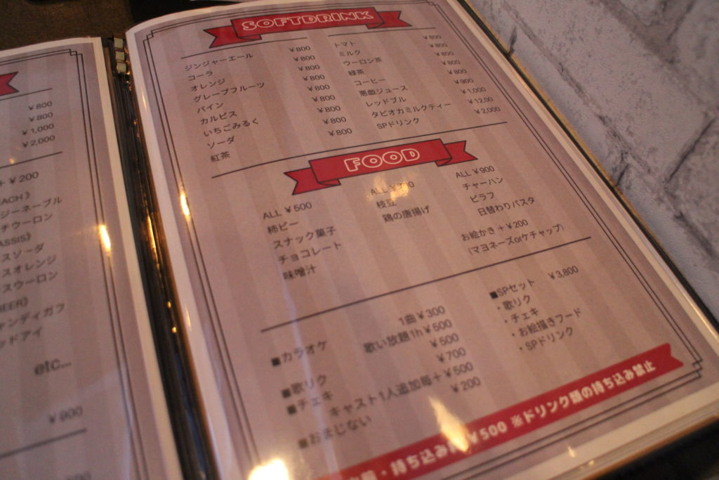 フードメニューもスナックが数点用意してあり、軽食も取れるよう他別途500円で持ち込みもできます。