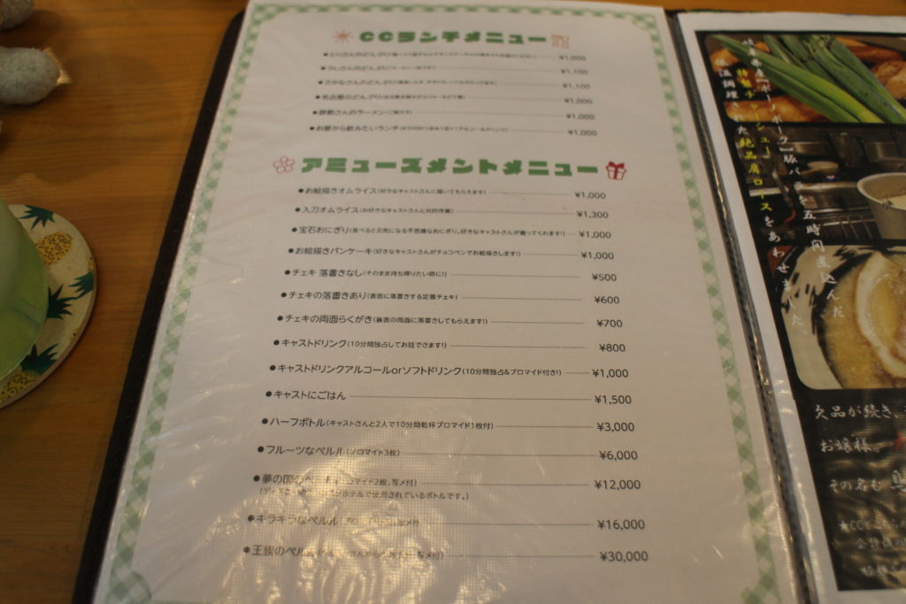 アミューズメントメニューはチェキが500円から、キャストドリンク800円から、キャストにご飯1500円など食事を差し上げることもできます。