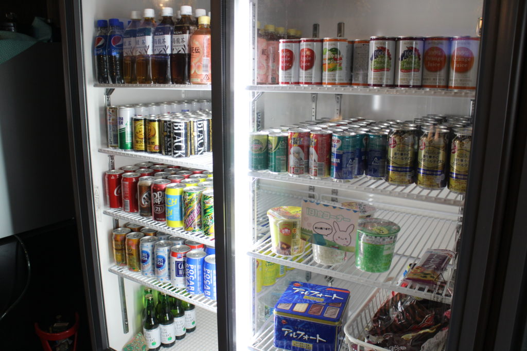 傍らには業務用冷蔵庫がどっしりと構え、驚くほどのボリュームでドリンク類が収納されている様が圧巻です。