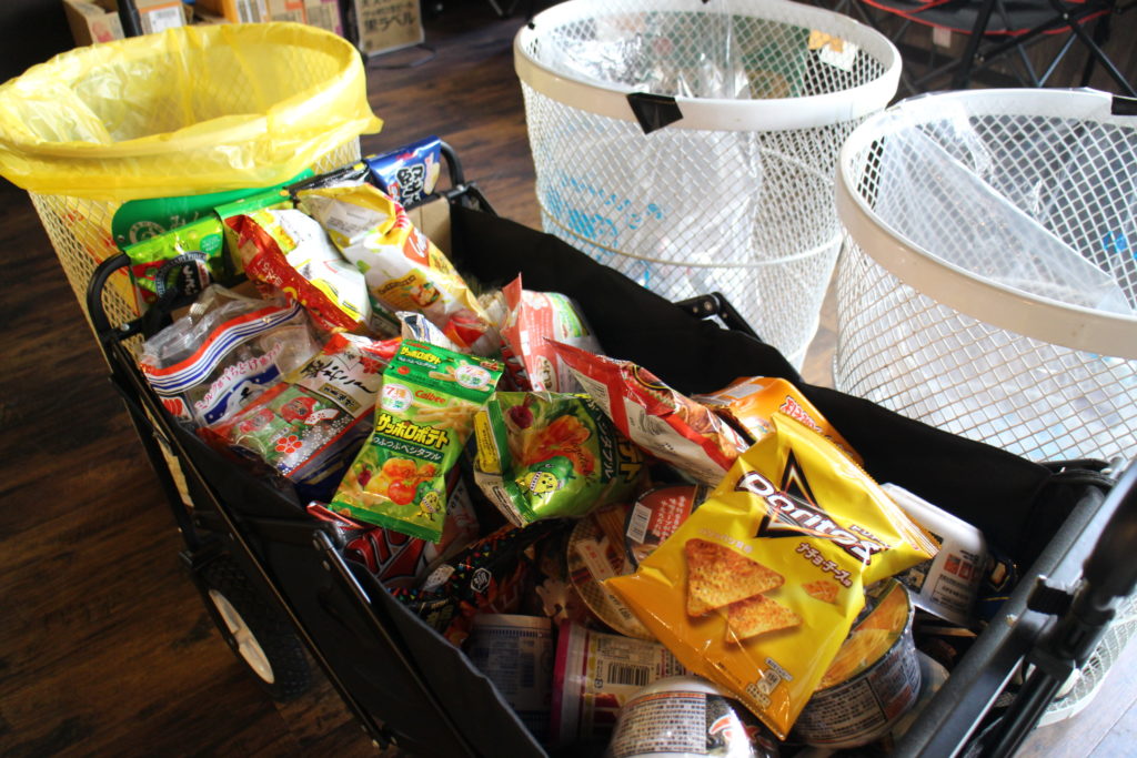 見渡せばキャンプ用品で埋め尽くされ、テントにアウトドアチェア、カートなど映えるギアがずらりと並び、キャンプ場でよく見る形状のゴミ箱も良いアクセントです。