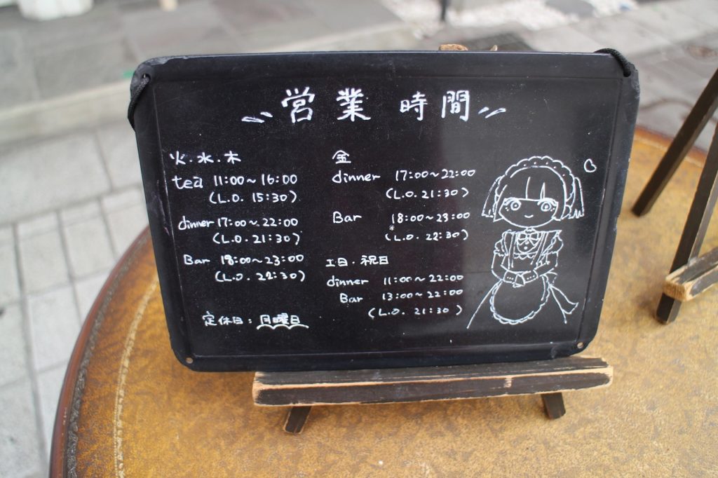 扉上部に店名が掛けられているのと、開店時は立て看板とメイド服が飾られるので確認ができます。