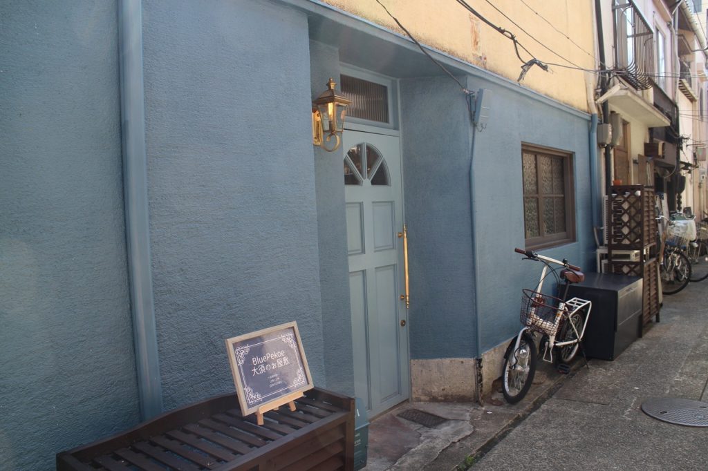 青の外観が目印で、開店時は店舗名を記した額が出るので確認ができます。