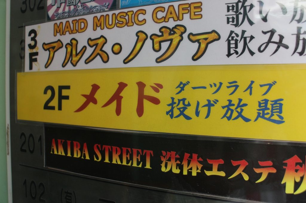 黄色い看板に大きな「メイド(ダーツライブ)投げ放題」の文言、アキバを歩けば誰もが気になるインパクト絶大な店舗にようやく伺うことができました。
