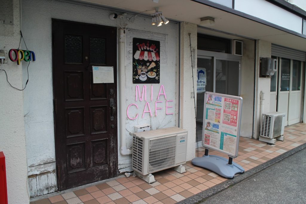 店頭には店名を知らせるネオン管が輝き、ファンシーな看板は甲府「ミアカフェ山梨店」を思わせる同系のイラストが可愛いですね。