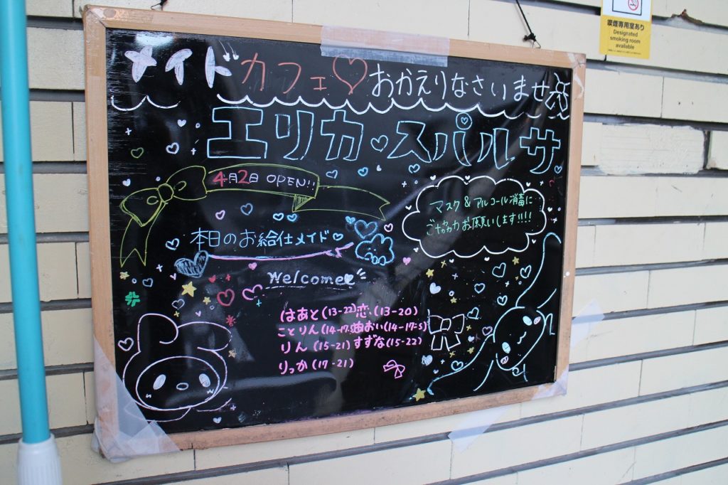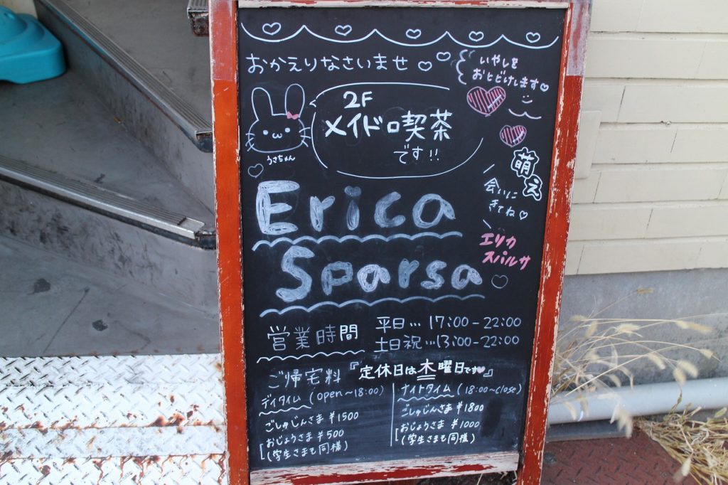 2階を見上げると当店のメイド服が見えるのと開店時階段に看板が出ます。