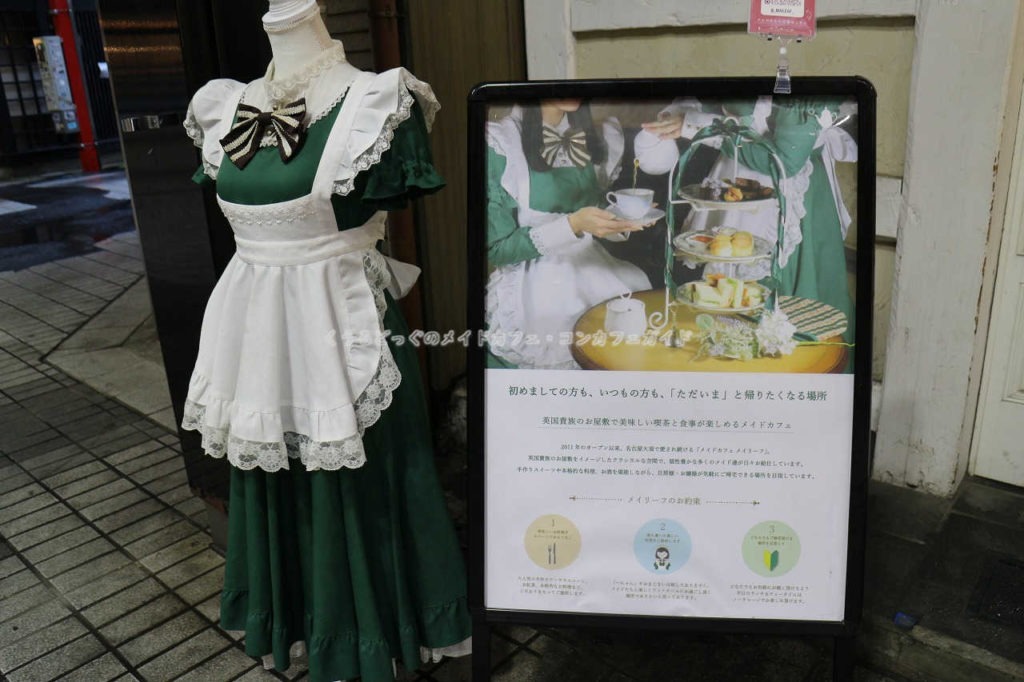 大須観音南側の仁王門通りを直進し右手に店舗があり、営業時は看板とメイド服が立ててあるので確認ができます。