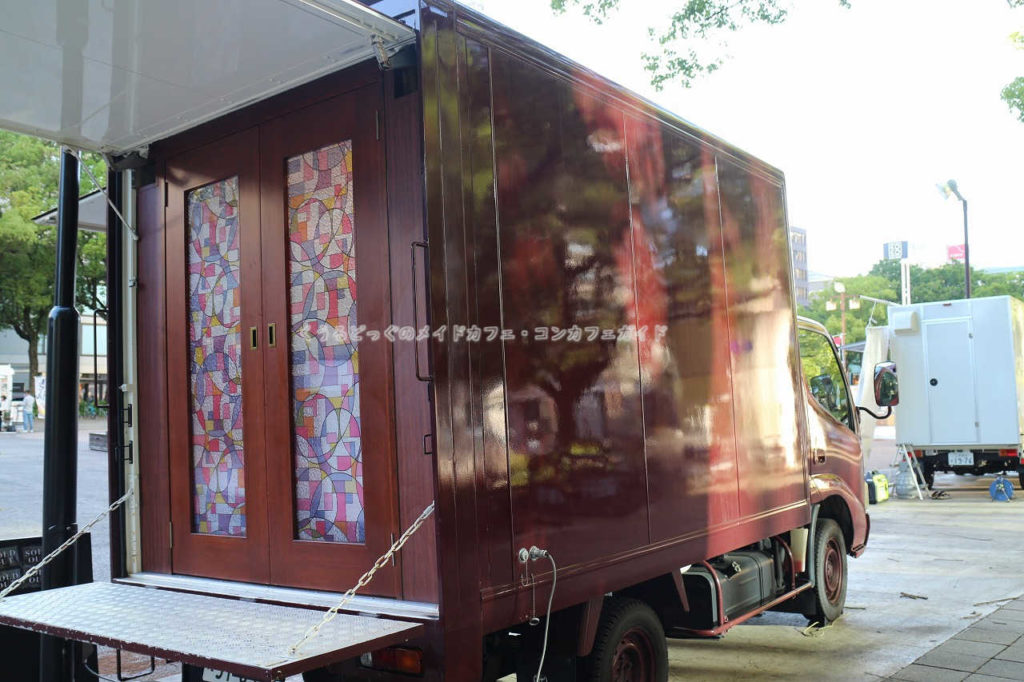 車は後ろのステンドグラスを模した大きな扉が出入り口となっていて、対面販売する側面は車の色味に合わせた木の温もり溢れる特別仕様の枠組みが施され、スライド式の窓から顔を出しメイドさんがやり取りする一挙手一投足が絵になっています。
