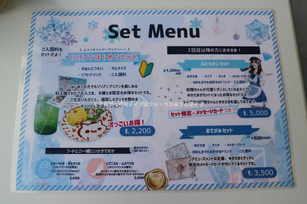 以前あったか不明な初めてセットは別紙、お絵かきオムライスにドリンクチェキとチャージ込みで2200円は破格なので初心者にうってつけ。