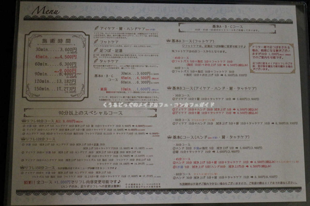 施術前メイドさんに相談する事で組み合わせを考えて下さるので希望を伝えると柔軟に要望に応えてくれます。
