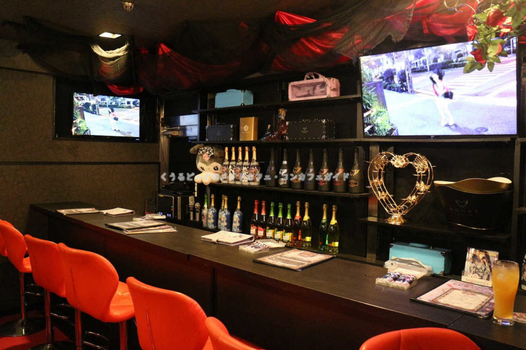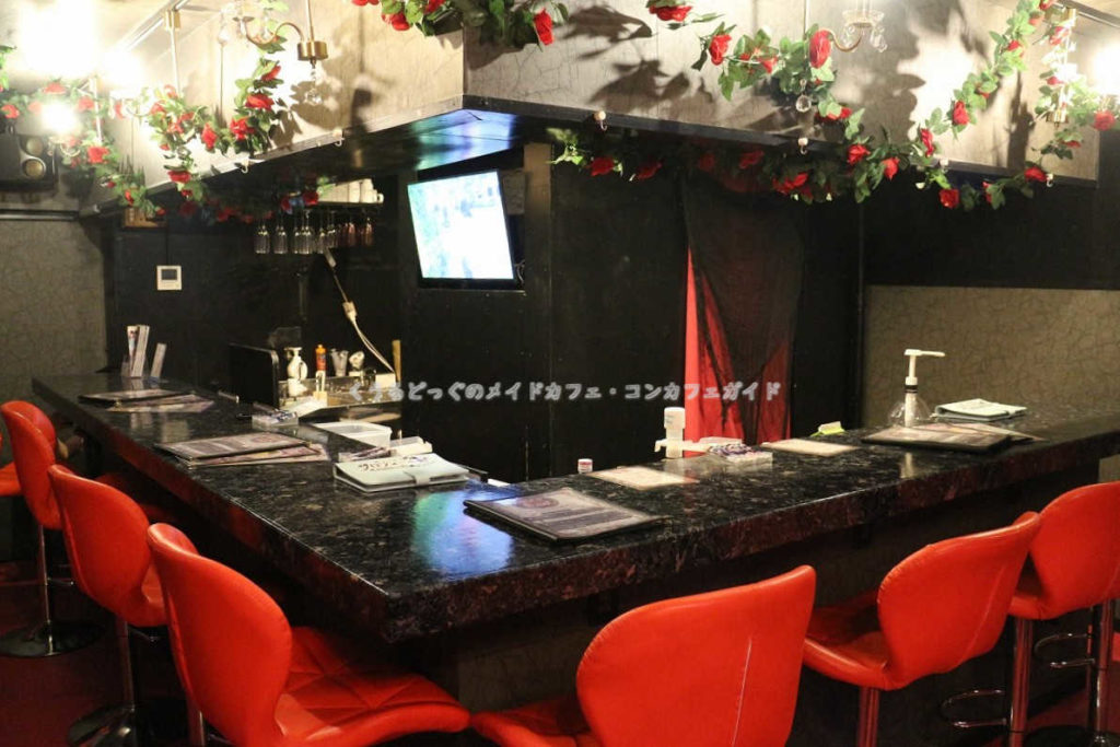 どちらの頭上にも薔薇の花を飾っていて、調度品同様色味を統一しているだけでなくカウンターに立つキャストに自信があるという店舗の拘りとも取れます。