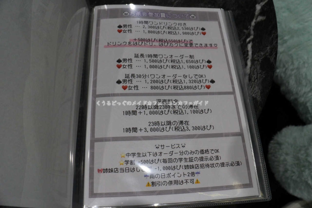 チャージ料金は60分2300円、女性は1800円でワンドリンク付きとなっています。