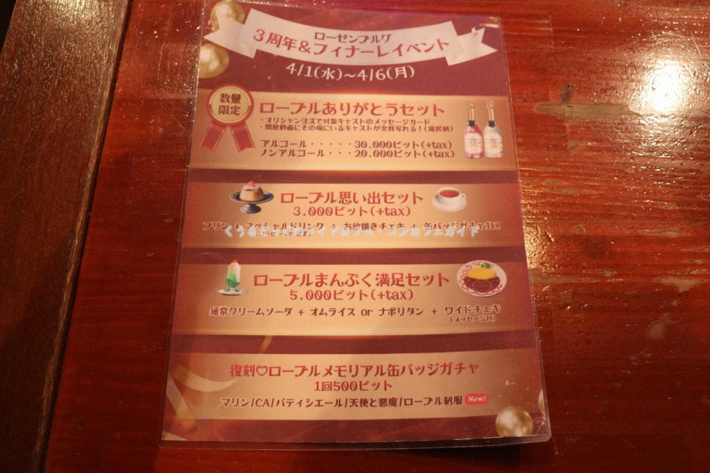 閉店前の6日間限定特別メニューがあり、「思い出セット」ではプリン、スペシャルドリンク、チェキと缶バッジがセット、「満腹セット」ではオムライスかナポリタンのいずれかとクリームソーダとワイドチェキのセットが用意されていました。
